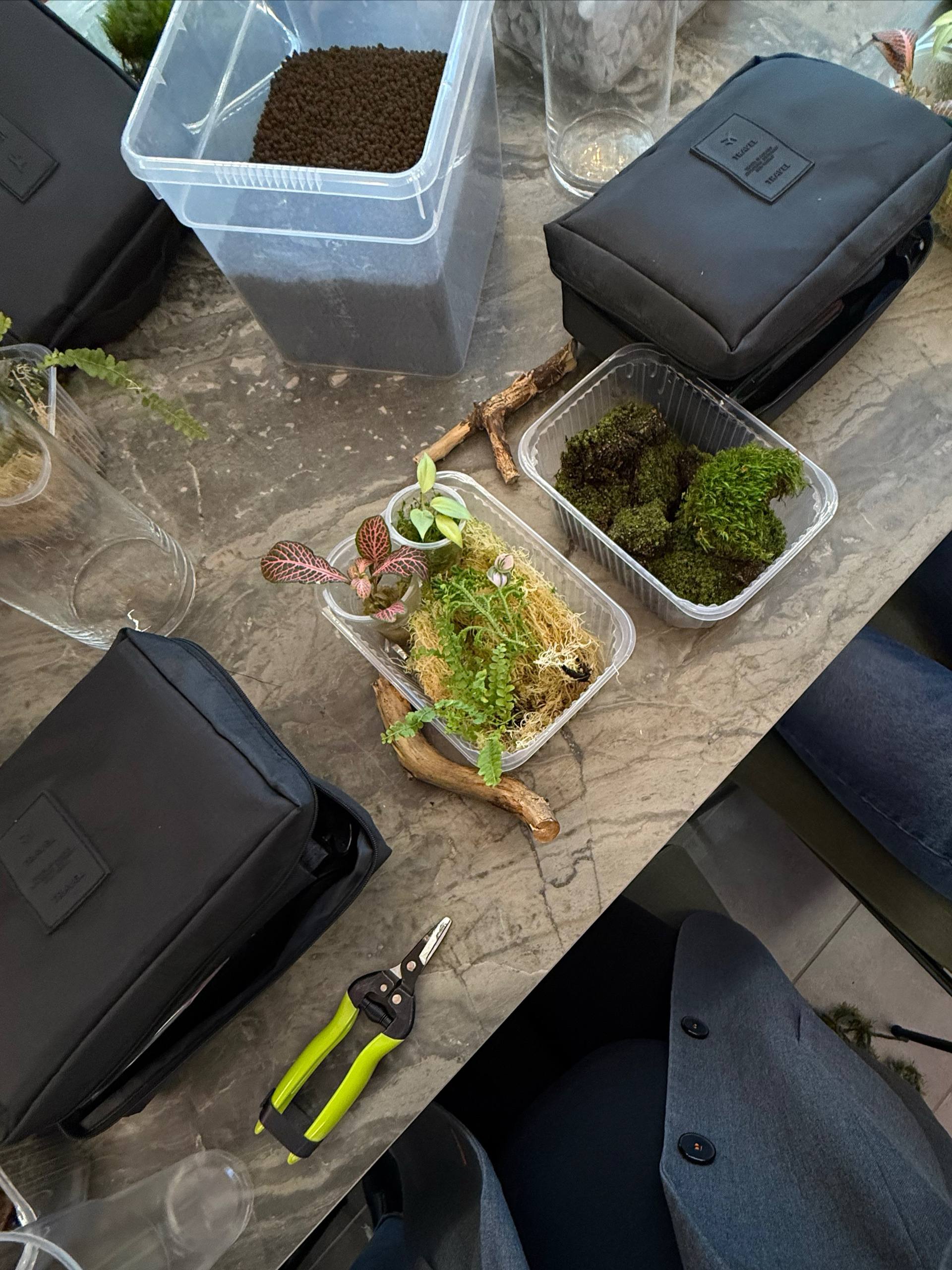 С самого порога вас встречает уютная, наполненная зеленью атмосфера нашей студии. Здесь пахнет свежей землёй, цветами и праздником. На столах всех участников ждут настоящие сокровища: прозрачные сосуды, кружевной мох, разнообразные камушки, корешки и миниатюрные растения, которые станут жителями вашего мира.